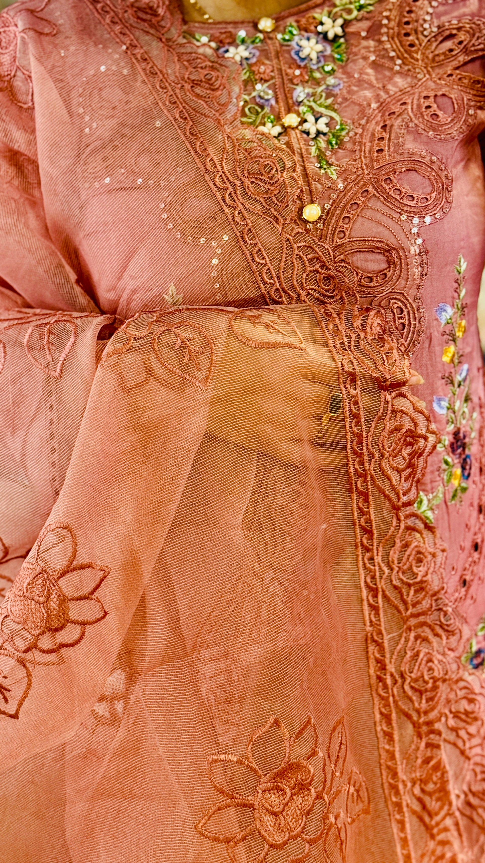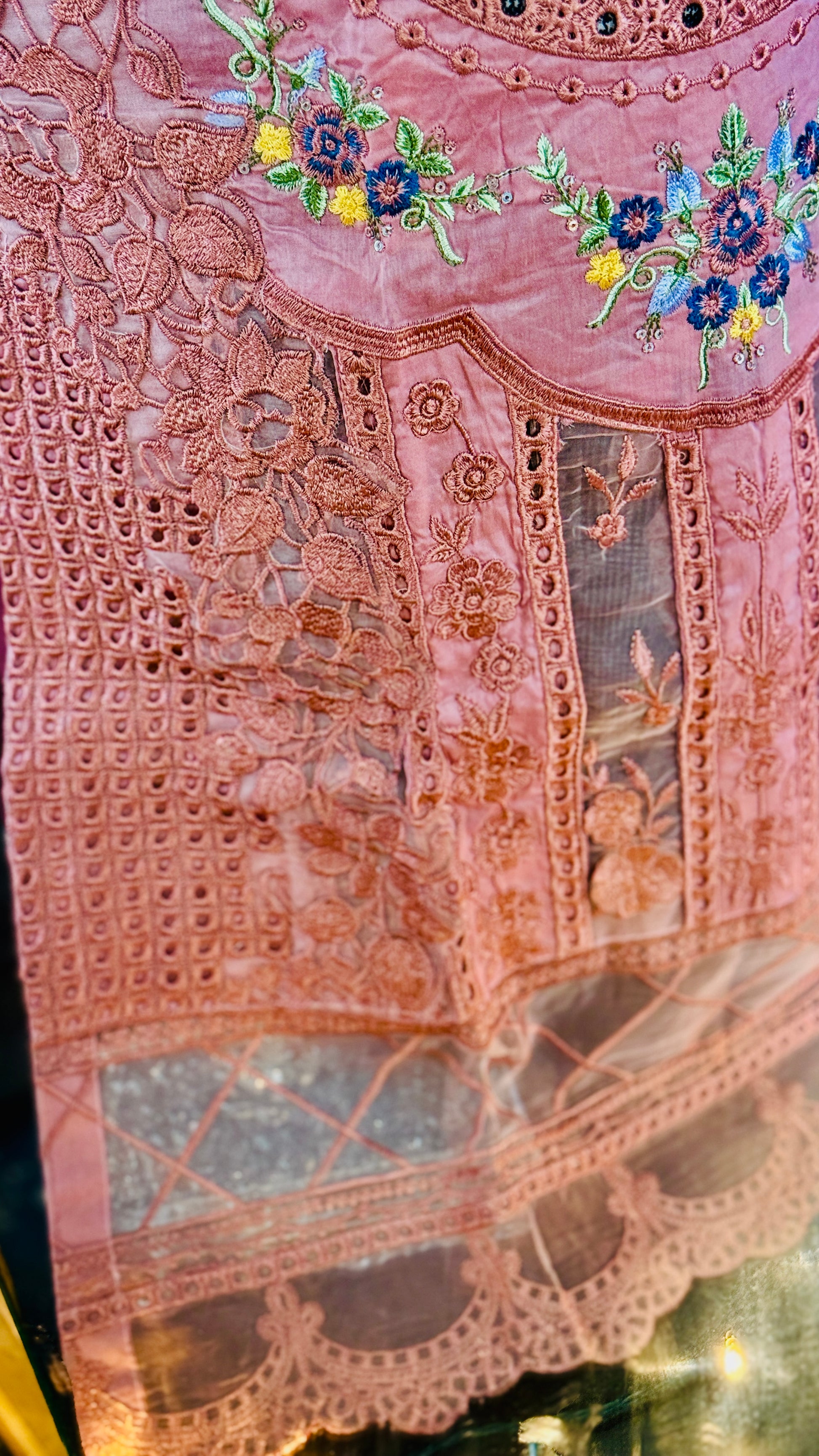 Radiate grace and sophistication with the Soothing Peach Embroidered Lawn Suit from F FOR FASHION London — a masterpiece of refined beauty and premium craftsmanship.