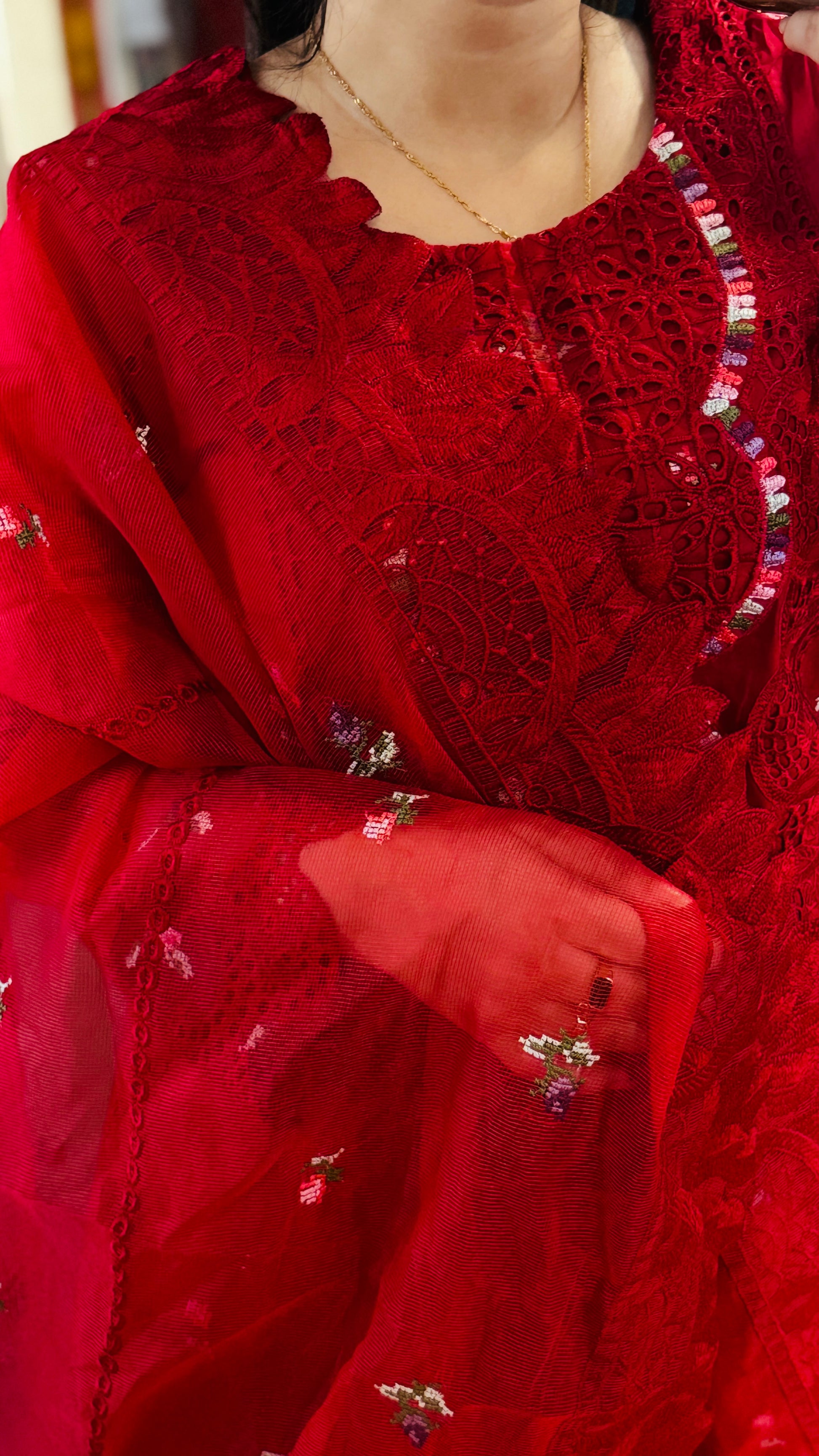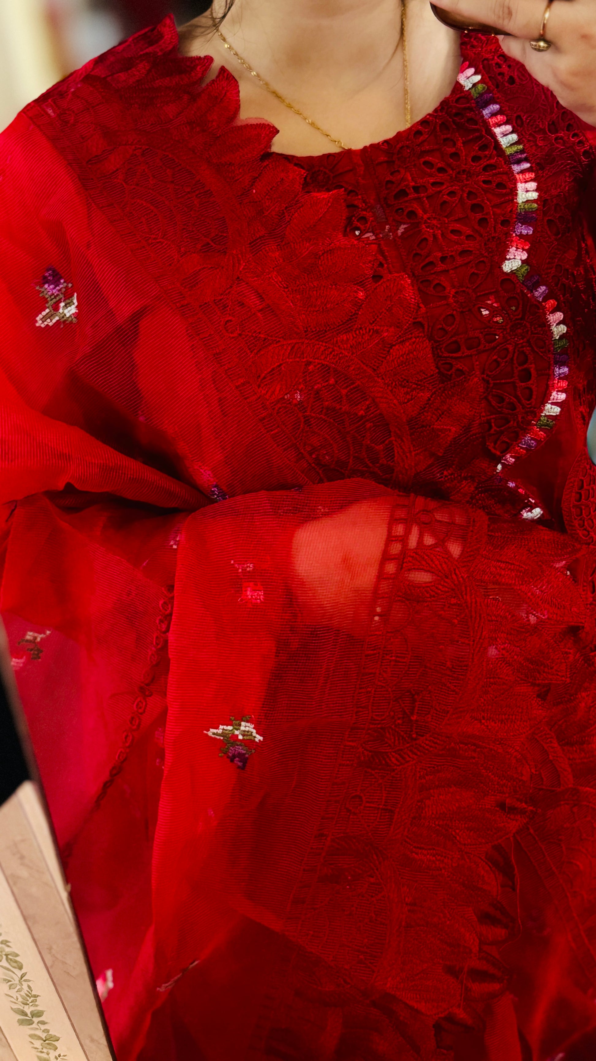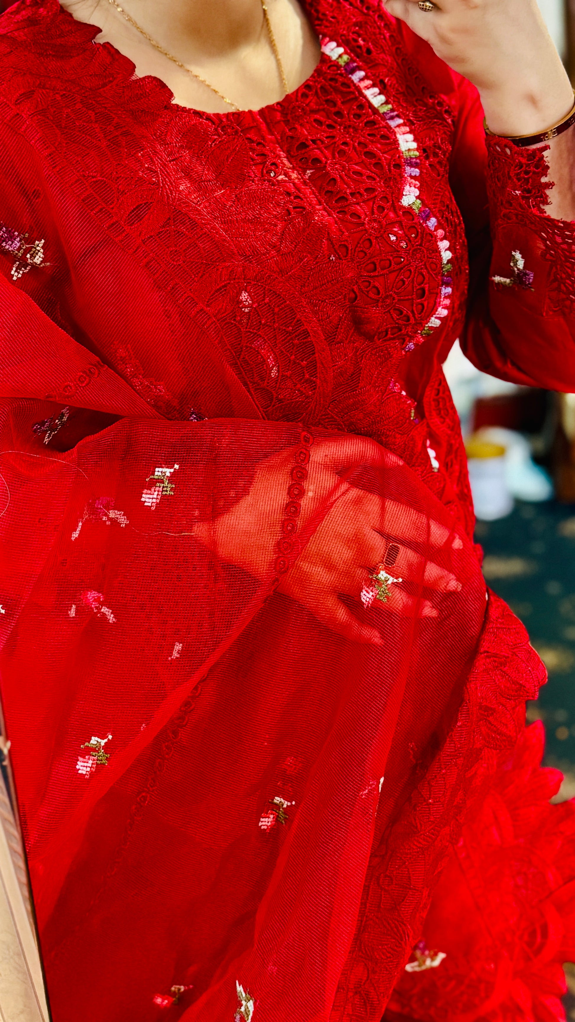 Power Red Embroidered Lawn Suit – Luxury 3 Piece Designer Outfit | F FOR FASHION London