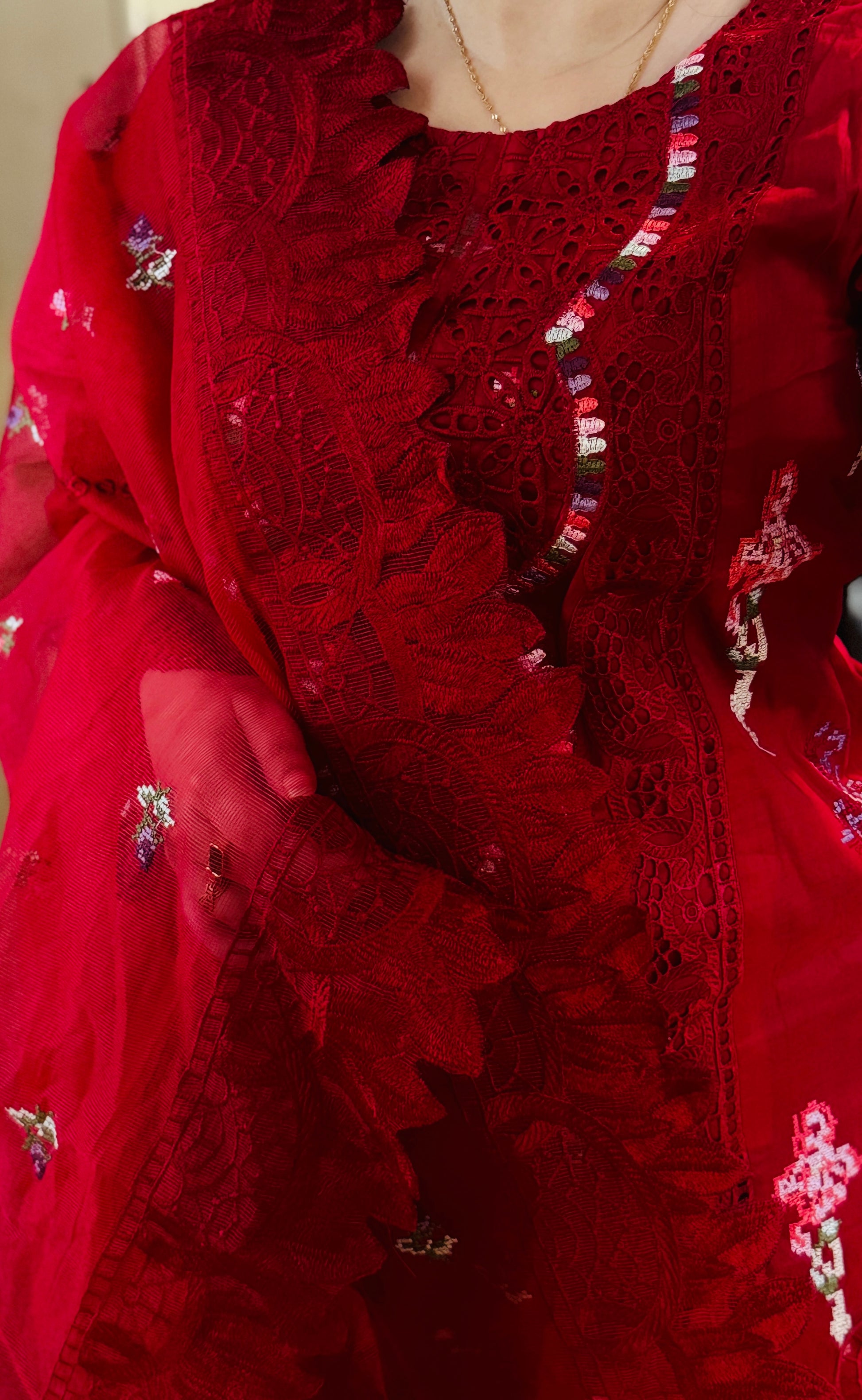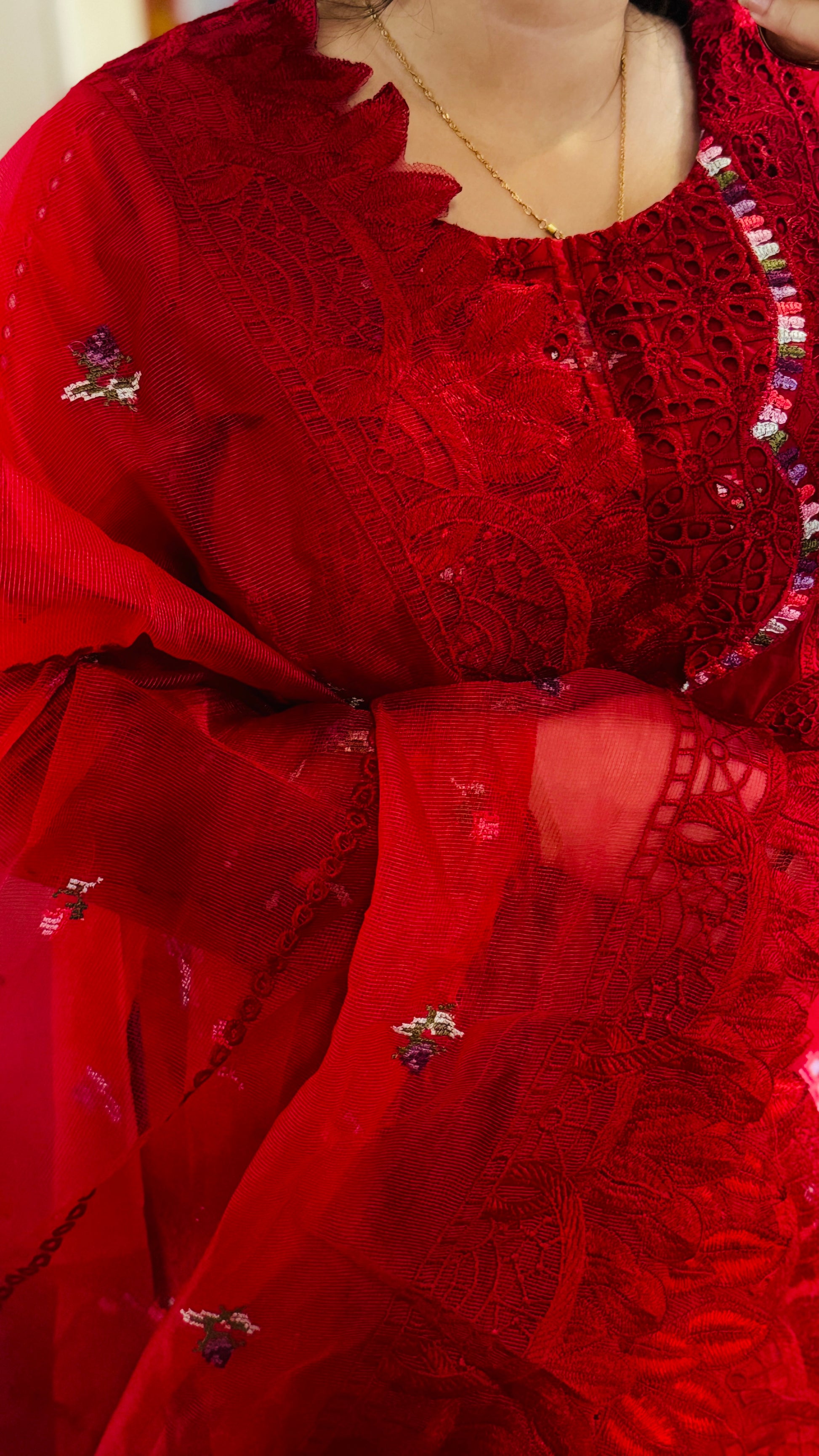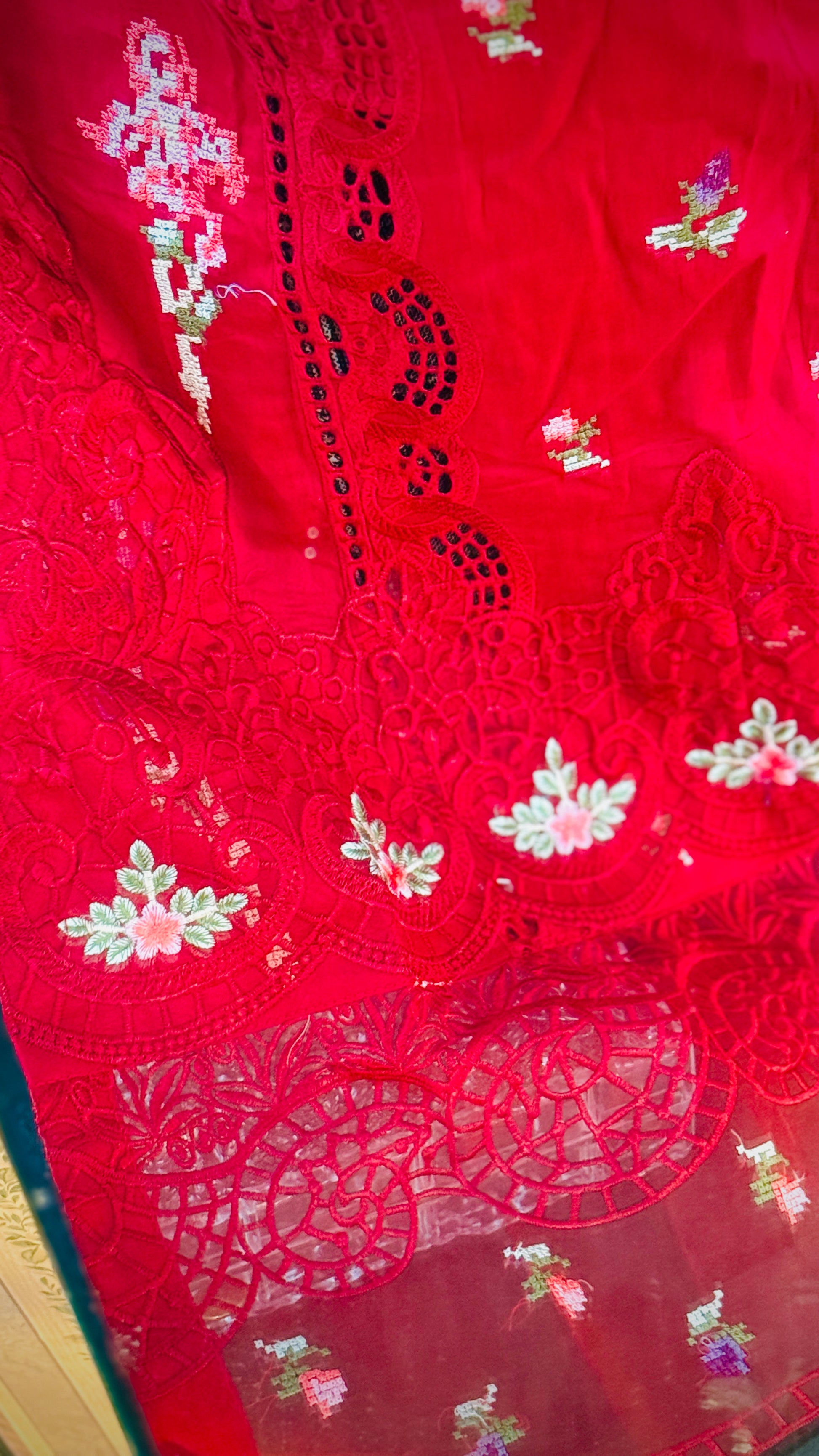Power Red Embroidered Lawn Suit – Luxury 3 Piece Designer Outfit | F FOR FASHION London