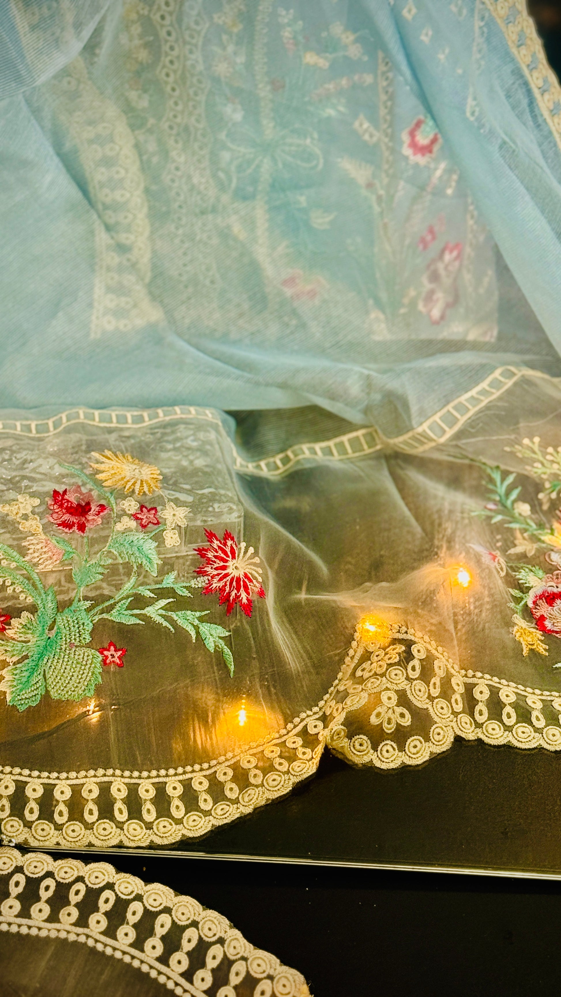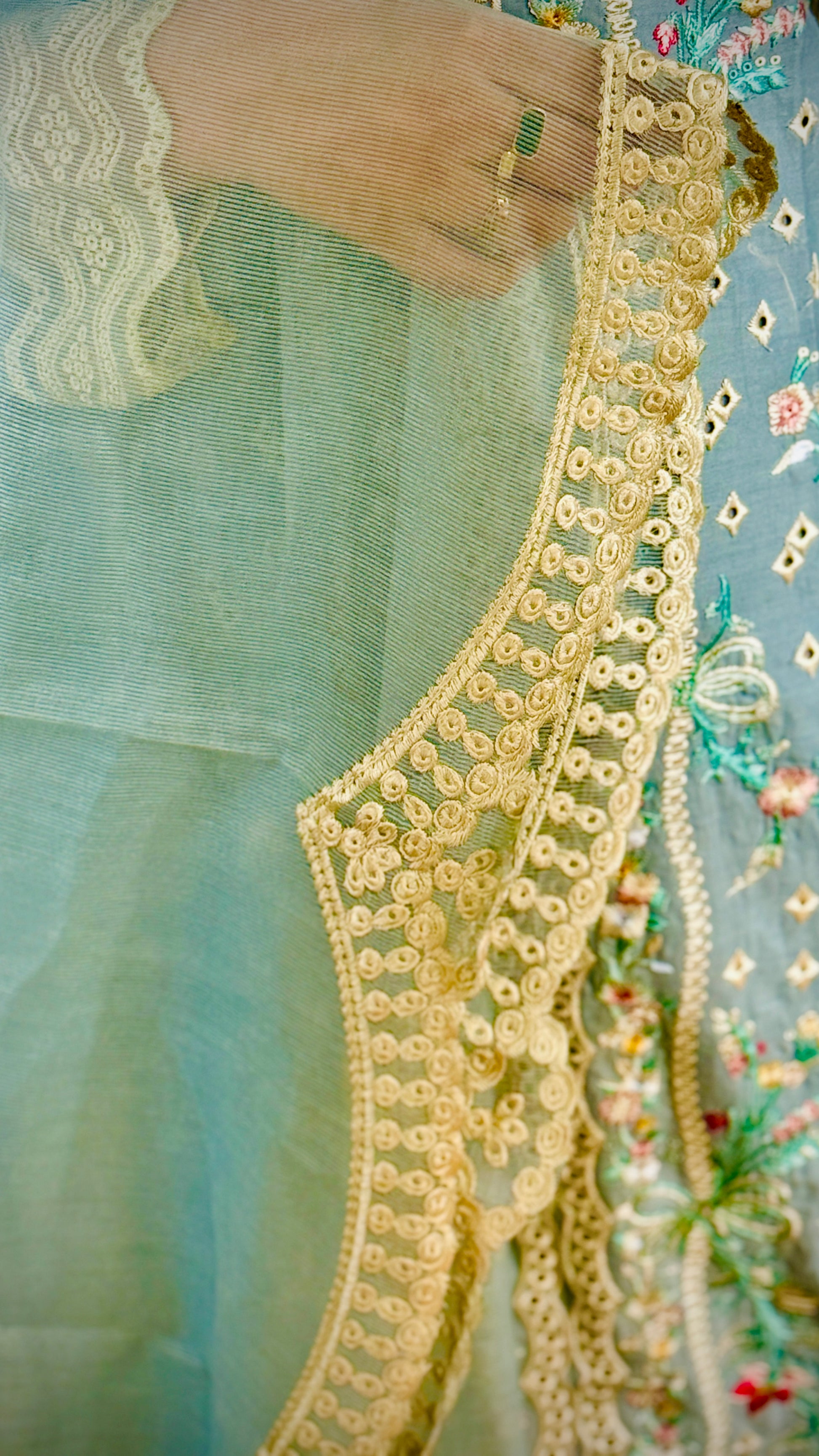 Discover timeless elegance with the Sky Blue Embroidered Lawn Suit from F FOR FASHION, where craftsmanship meets luxury. This exclusive 3-piece stitched designer outfit is tailored in London by expert craftsmen, ensuring a flawless fit and premium finish.