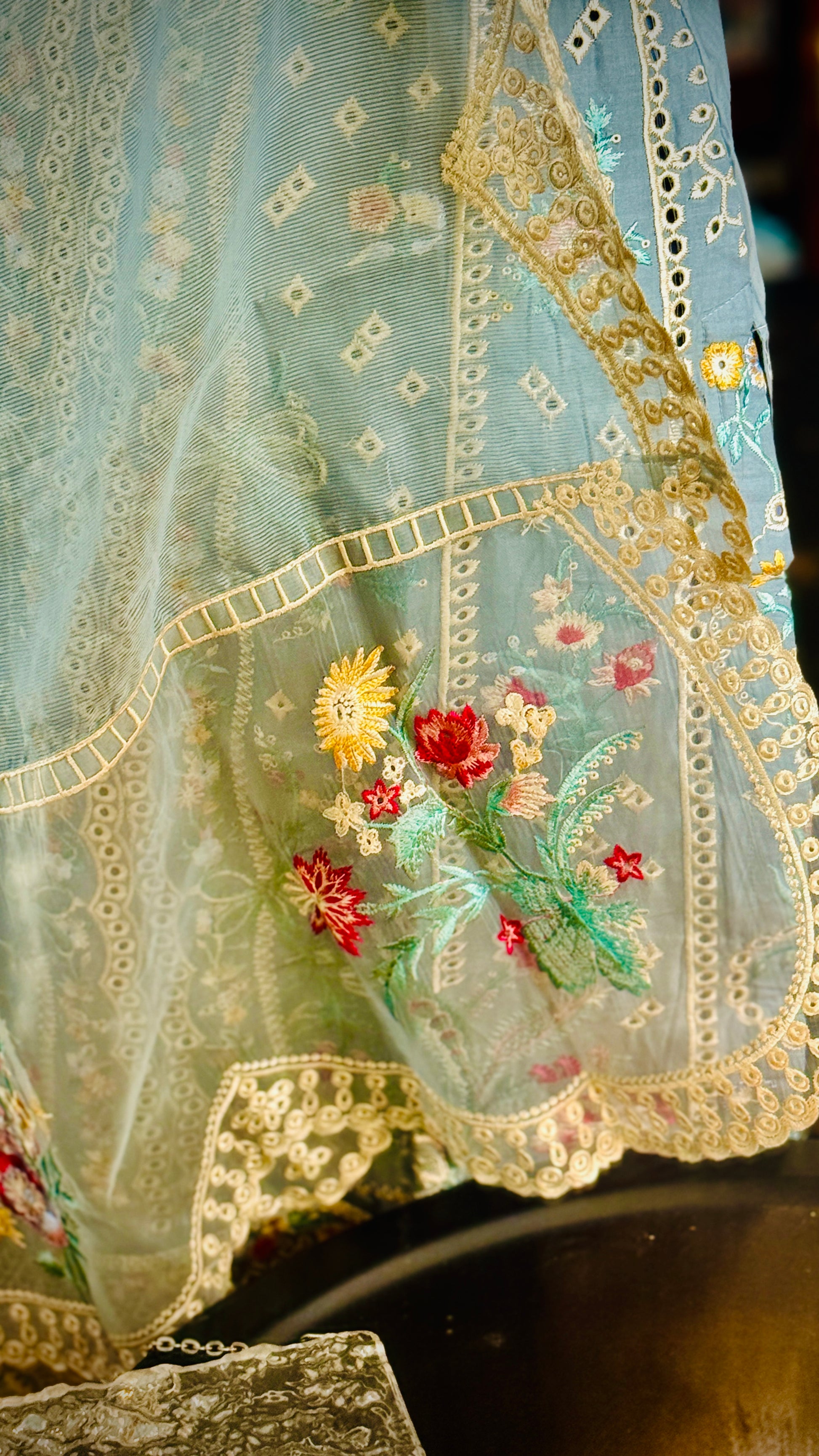 Sky Blue Embroidered Lawn Suit – 3 Piece Stitched Designer Dress | Luxury Pakistani Outfit by F FOR FASHION London